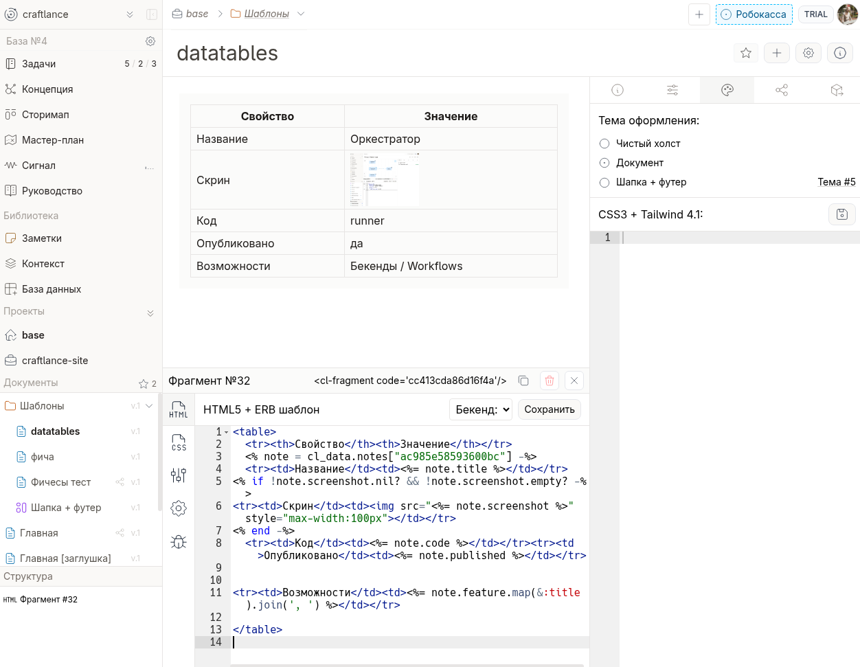Промысел, Craftlance — платформа для мгновенного создания и публикации и передачи товарищу заметок, веб-страниц и воркфлоу сценариев. С полным контролем верстки, бекенд кода, таблиц и базы данных. Пишите ERB-фрагменты, стилизуйте через Tailwind CSS, сохраняйте версии, публикуйте иди передавайте результаты простой командой. Никаких серверов, CI/CD и настройки инфраструктуры.